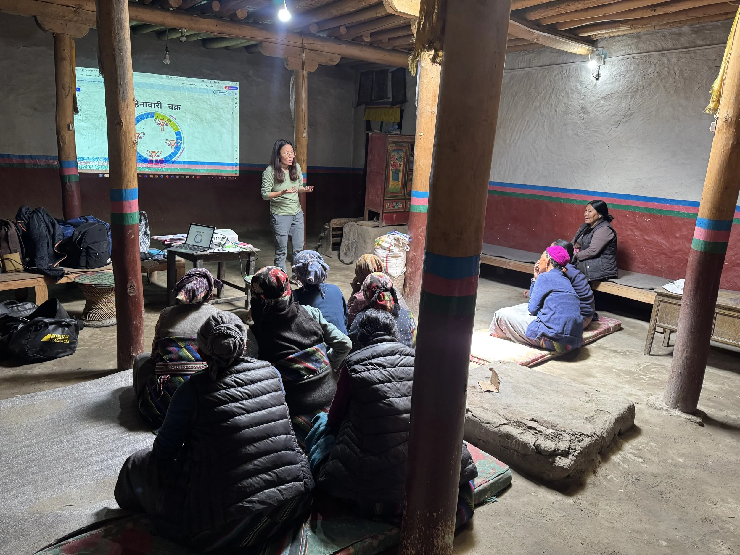 At the beginning, many participants viewed menstruation as impure. Some referred to it as ལུས་ཀྱི་ནད་ (“Lu Kyi Neh”), translated as “a disease of the body.” Most women believed that periods began from the hips, as they had always heard it described with the word “kepa” from their mother and sister, which means “hips” in the Mustang language. During the sessions, these misconceptions were gently addressed, opening space for dialogue and better understanding. By the end, participants felt more comfortable and began asking questions about family planning, white discharge, and the health of the uterus and breasts.